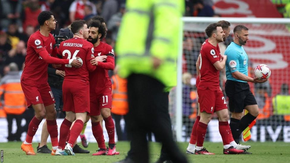 A linesman (basically an assistant ref) allegedly elbowed a Liverpool player at the end of the first half. Sounds like he was out of linesman.