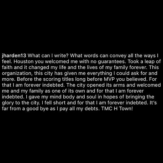 While we will never know how the rest of Harden’s teammates really feel, we know how Harden feels about the city of Houston.