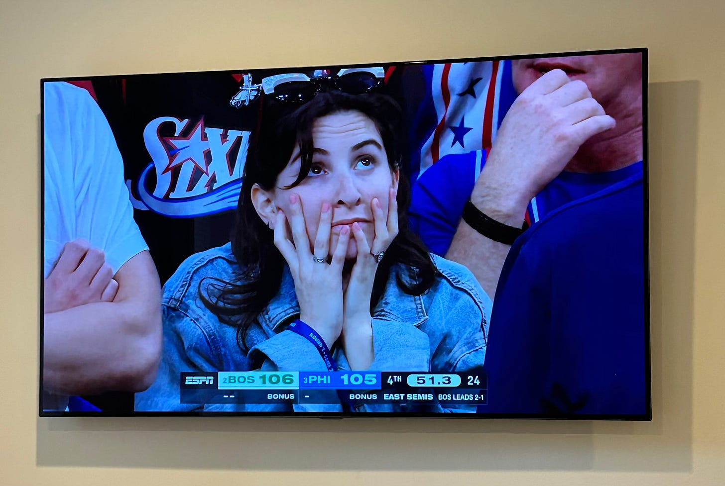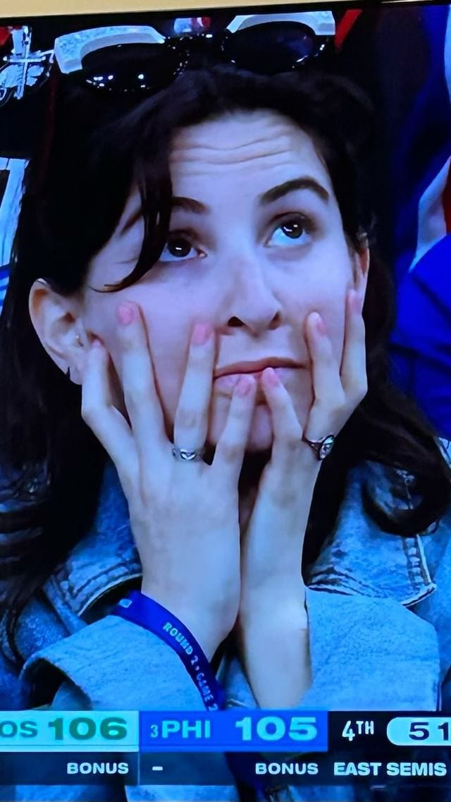 I am decidedly NOT a Sixers fan (though I love this city), but all basketball fans can relate to her emotions in that moment. And the outfit has Hallie vibes for sure!